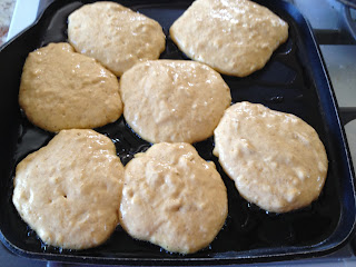 Heat a skillet on the stove top with a bit of Canola oil. Drop the batter by spoon or small ladle and cook approximately 1 to 2 minutes per side. Yield 16 pancakes.